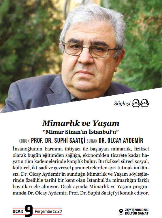 İnsanoğlunun barınma ihtiyacı ile başlayan mimarlık, fiziksel olarak bugün eğitimden sağlığa, ekonomiden ticarete kadar hayatın tüm kademelerinde karşılık bulur. Bu fiziksel süreci sosyal, kültürel, iktisadî ve çevresel parametrelerden ayrı tutmak imkânsız. Dr. Olcay Aydemir’in sunduğu Mimarlık ve Yaşam söyleşilerinde özellikle tarihî bir kent olan İstanbul’da mimarlığın farklı boyutları ele alınıyor. Ocak ayında Mimarlık ve Yaşam programında Dr. Olcay Aydemir, Prof. Dr. Suphi Saatçi’yi konuk ediyor.