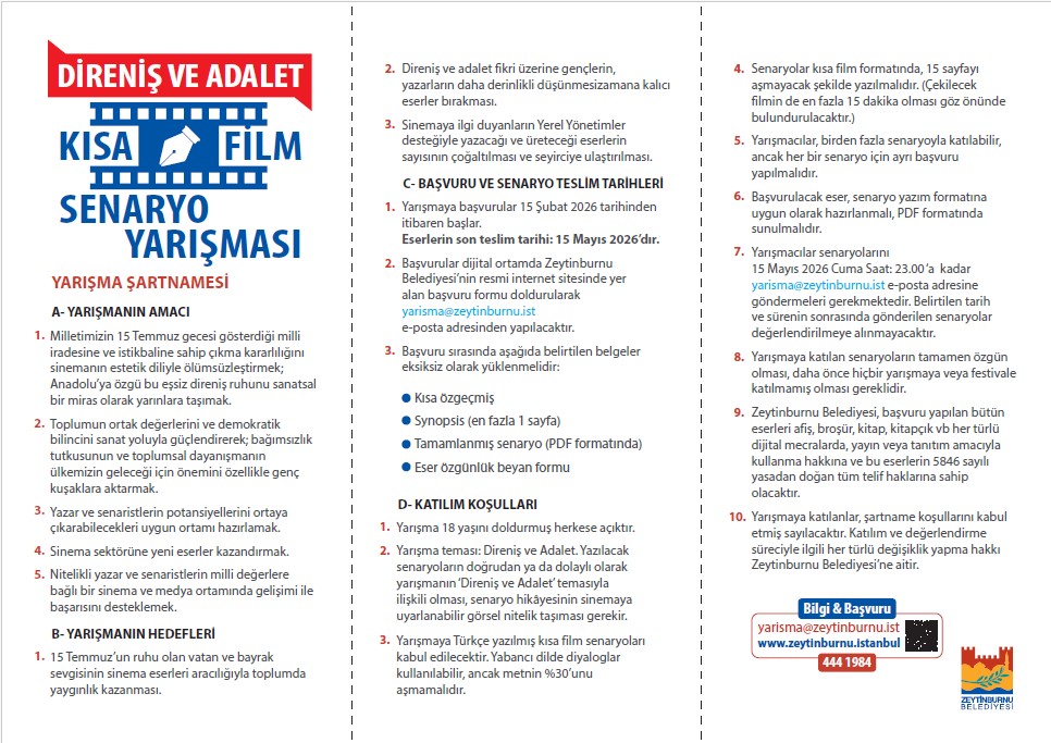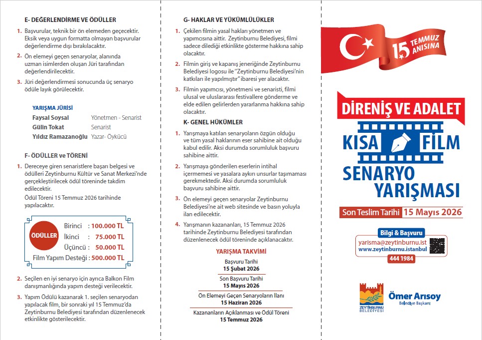 Zeytinburnu Belediyesi, 15 Temmuz’un 10. yılına doğru ilerlerken toplumsal hafızayı sanatın estetik diliyle geleceğe taşımak amacıyla “Direniş ve Adalet” temalı Kısa Film Senaryo Yarışması düzenliyor. Yarışma kapsamında toplam 725 bin TL ödül dağıtılacak; birinci seçilen senaryo ise 500 bin TL’lik yapım desteğiyle profesyonel bir kısa filme dönüştürülecek.
