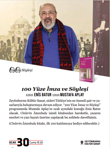 Zeytinburnu Kültür Sanat, sizleri Türkiye’nin en önemli şair ve yazarlarıyla buluşturmaya devam ediyor. “100 Yüze İmza ve Söyleşi” programında Mustafa Aplay’ın ocak ayındaki konuğu Enis Batur olacak. Cinlerin İstanbulu isimli kitabından hareketle, yazarın eserleri ve yazı hayatı üzerine yapılacak bu sohbete davetlisiniz. (Cinlerin İstanbulu kitabı, ilk 100 katılımcıya hediye edilecektir.)