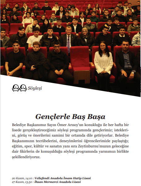 Belediye Başkanımız Sayın Ömer Arısoy’un konukluğu ile her hafta bir lisede gerçekleştireceğimiz söyleşi programında gençlerimiz; isteklerini, görüş ve önerilerini samimi bir ortamda dile getiriyorlar. Belediye Başkanımızın tecrübelerini, deneyimlerini öğrencilerimizle paylaştığı; eğitim, spor, kültür ve sanatın yanı sıra Zeytinburnu’muzun geleceğine dair fikirlerin de konuşulduğu söyleşi programında yarınımızı birlikte şekillendiriyoruz.