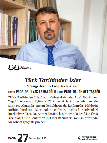 “Türk Tarihinden İzler” adlı söyleşi dizisinde, Prof. Dr. Ahmet Taşağıl moderatörlüğünde Türk tarihi farklı veçhelerden ele alınıyor. Alanında uzman konukların da katılımıyla Türklerin tarihte bıraktığı izler takip ediliyor, tarihsel serüvenleri inceleniyor. Prof. Dr. Ahmet Taşağıl, kasım ayında Prof. Dr. İlyas Kemaloğlu ile “Cengizhan’ın Liderlik Sırları” konusu etrafında bir sohbet gerçekleştirecek.