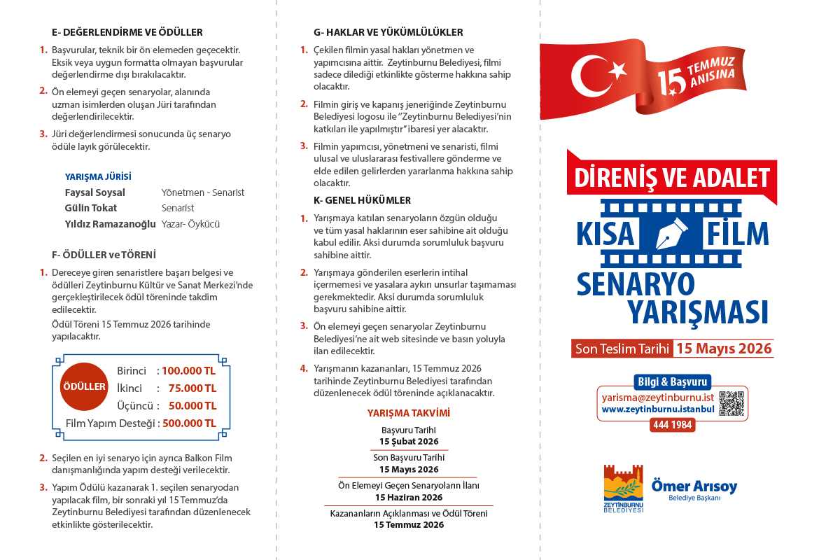Zeytinburnu Belediyesi tarafından düzenlenen “Direniş ve Adalet” temalı Kısa Film Senaryo Yarışması için geri sayım başladı. Genç senaristlere önemli fırsatlar sunan yarışmada son başvuru tarihi 15 Mayıs 2026 olarak açıklandı.