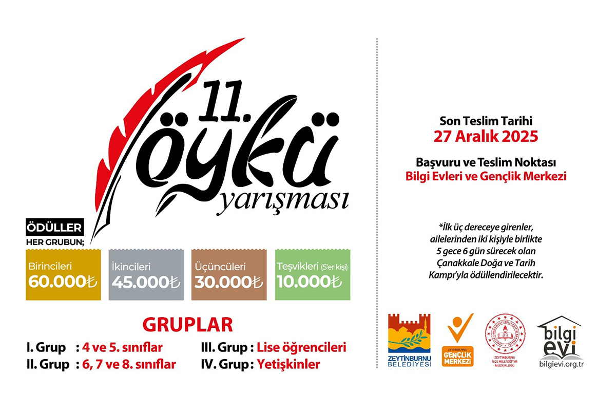 Zeytinburnu Bilgi Evleri ve Gençlik Merkezi’nin 11. Öykü Yarışması’nda başvurular 27 Aralık 2025’te sona eriyor. Toplam 740 bin TL ödülün dağıtılacağı yarışmada dereceye girenler, ödülün yanı sıra Çanakkale Doğa ve Tarih Kampı deneyimi de kazanacak.